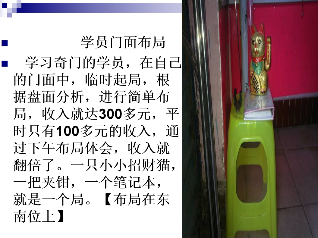 奇门核心高层的财富奇门极速转运布局秘法,简单易懂,无论男女老幼,有无易学基础均可学会,让您系统学到奇门中的核心知识,起局简易,不用死记硬背。布局灵活,布局后在该时辰会出现相应的人,或事物,下雨等现象。利用所布物品调整气场,配合方位时空能量来达到增加能量磁场的目的,从而增加财运的3至5倍。将是为企业界策划人士,管理总裁, 企业讲师,营销精英,金领,白领人士,及想从事商务行业等的朋友们提供发展自我,实现自我人生价值,放飞人生梦想的舞台。