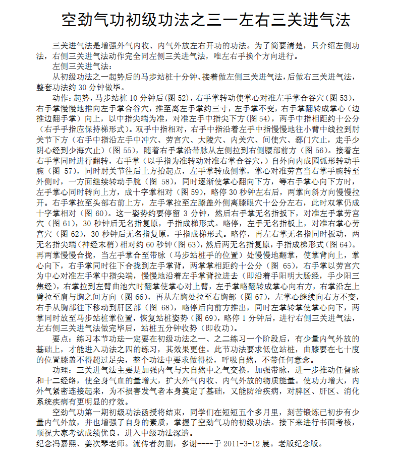 空劲气功是众多功法流派中的一种名称,但又贯彻在整个功法之中。此功法自修炼至发放外气为他人治病都不接触人体表皮。空劲气功是一门科学性很强、疗效很高、得气最快的一种功法,为了了解空劲气功特点,我概括了十六个字:“外气内收、内气外放、毋须意守、循环如常”。