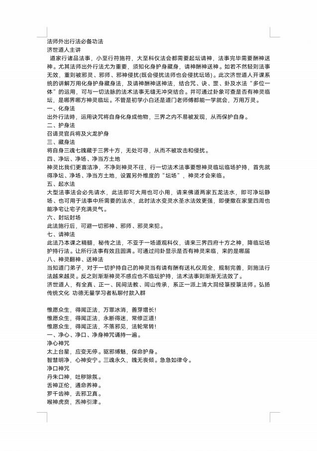 道家行诸品法事,小至行符施符,大至科仪法会都需要起坛请神,法事完毕需要酬神送神。尤其法师出外行法尤为重要,须知化身护身藏身,请神酬神送神。如若不然轻则法事无效,重则被邪灵、邪师、邪神侵扰(既会侵扰法师也会侵扰坛场)。此次济世道人开课系统的讲解万用化身护身藏身法,及请神酬神送神法,结合咒、诀、罡、卦及水法“多位一体”的运用,可与一切法脉的法术法事无缝无冲突结合。并可通过卦象可查是否有神灵临坛,是哪界哪方神灵临坛。不管是初学小白还是道门老师傅都能一学就会,万用万灵。