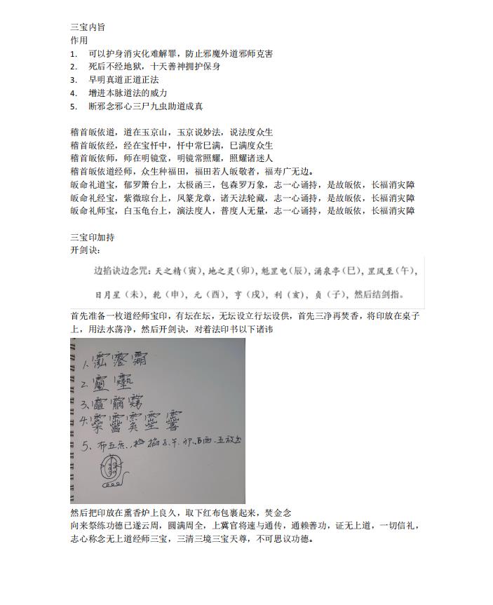 1.本门三宝内旨修持法。平时人行住坐卧皆可行持,三宝者,道经师也,天下之道法都是三清衍生,故而修持三宝第一能消除罪业,第二能精进修行,趋吉避凶,第三可以,消灾获福,此法也属于本门专属的秘旨修持方法,常常修持可以获得三宝的加持,类似于无形且随时随地都可以的,增功符万用符,此乃本门核心内诀。2.三宝法印祭炼法。此法是专门用来祭炼雷印三宝印的秘法夫此法是拿来加持三宝印的,三宝印天下通用万法通行此法有二,一祭印开印,一练印,印常常练之,可以越练越灵,越练越应,甚至于一个印代替符纂。3.神霄祭炼都天大雷火印。该印是雷霆都司的重要法印,具有镇治天下山川仙官鬼神,差遣分野城隍庙社吏兵,役使风雷,驱除神怪,诛斩妖魅,祈求雨雪风晴的巨大法力。雷火二字难以小觑,加之都天二字,总辖雷部风火是神霄派所需要的重要法印,大多加持在符上,增加雷火类符,驱邪类符的法力威力,天下邪祟莫不屈服于雷火也4.五雷号令祭练秘法。本门多用五雷号令,此法是以身内雷气来练雷令,雷令会比一般方法祭炼出来的令牌更加强大。可以增强自身与令牌的感应,众所周知令牌法器认主,第一种方法就是日久认主,而这种方法事半功倍,可以更快的让法器跟自己冥冥之中产生感应联系,从而认主更灵既然是祭炼法器必然是有祭有练,祭过之后再用雷气洗练雷令,可以增强令牌法力。