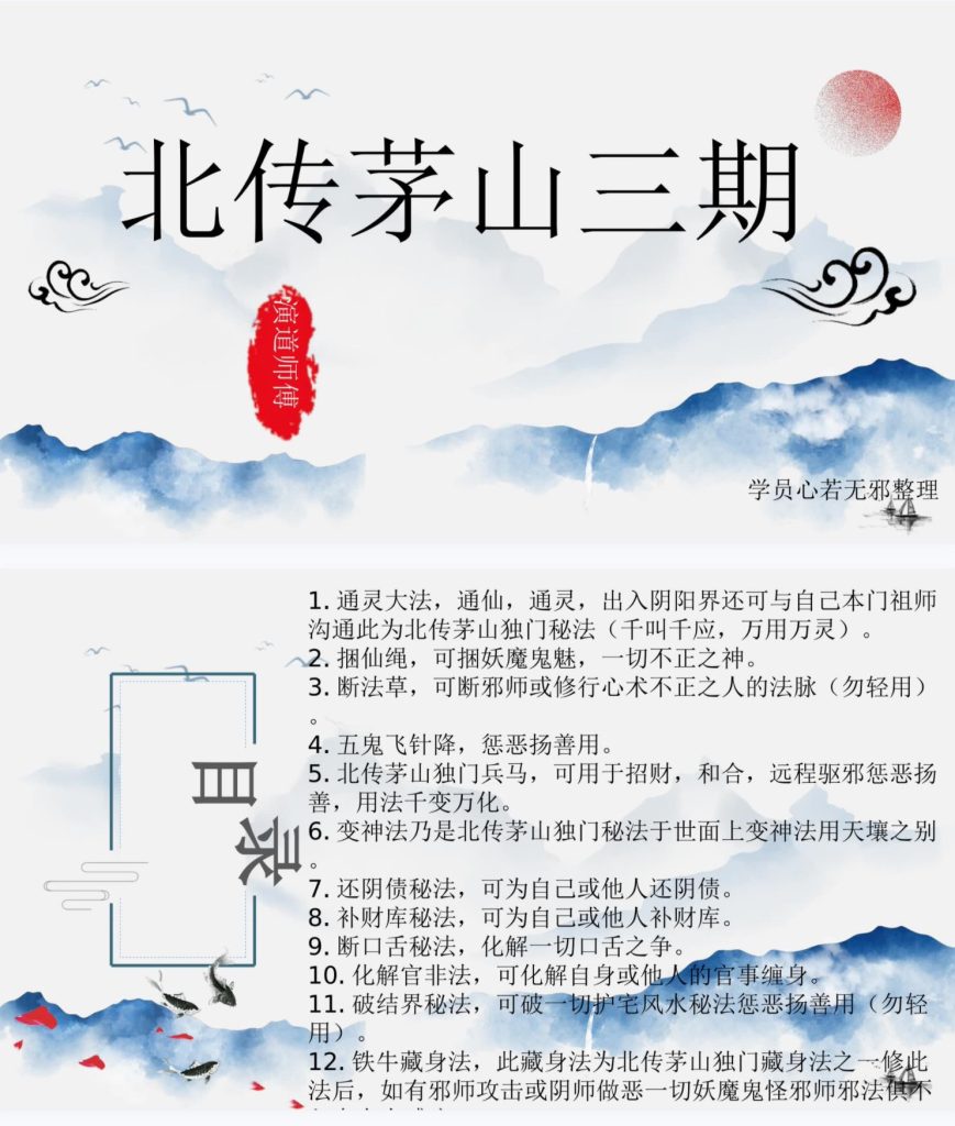 1.通灵大法,通仙,通灵,出入阴阳界还可与自己本门祖师沟通此为北传茅山独门秘法(千叫千应,万用万灵)。