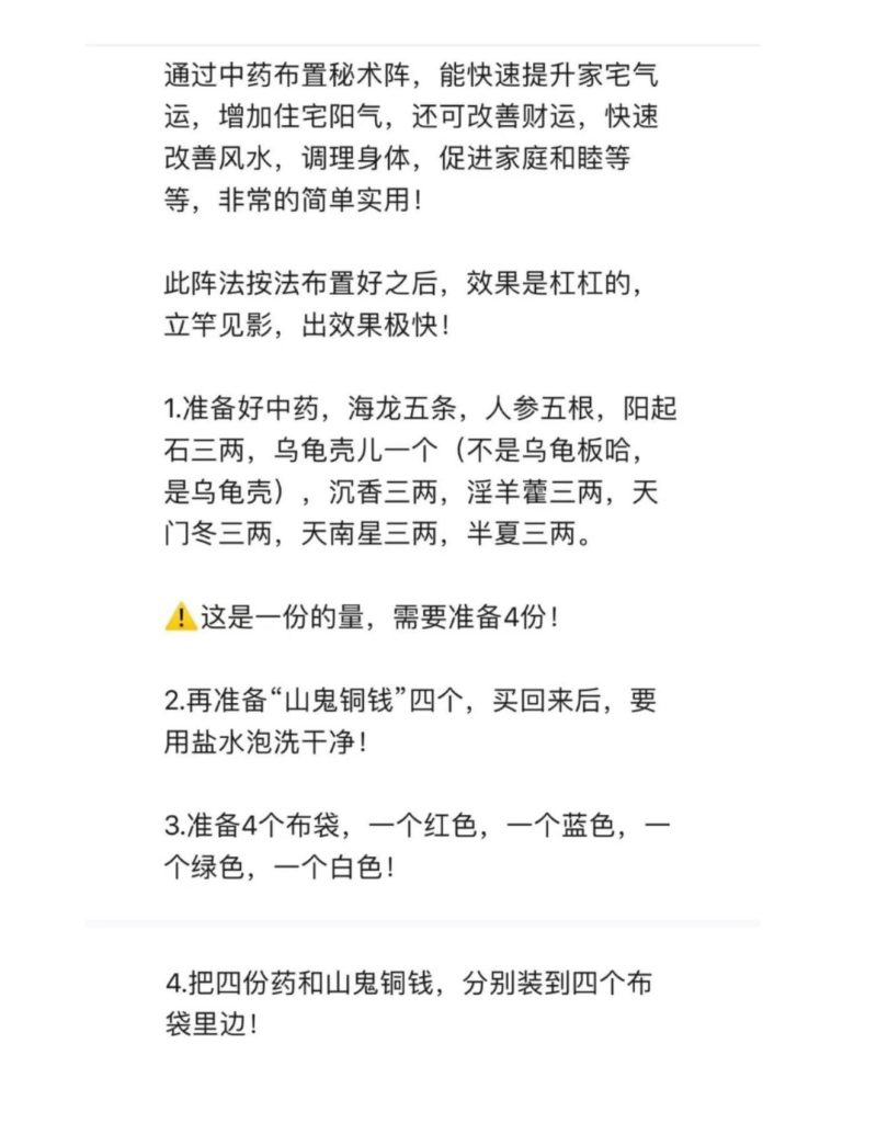 中药阵法:总比单味药管用;阵法,当然比单兵更强大!一:提升宅运中药阵通过中药布置秘术阵,能快速提升家宅气运,增加住宅阳气,还可改善财运,快速改善风水,调理身体,促进家庭和睦等等,非常的简单实用!此阵法按法布置好之后,效果是杠杠的,立竿见影,出效果极快!口传网授,学会就能应用!这个阵法的药材效果可以维持1年,一年一换即可,效果非常不错的!1.八卦有病之解方离卦药方艮卦药方 坤卦药方震卦药方巽卦药方 坎卦药方 兑卦药方乾卦药方2.药的期限 3.天医风水的中药化解中药化解家宅不安4.八宫缺角中药化解乾宫缺角中药化解北方坎宫缺角中药化解艮宫缺角中药化解震宫缺角中药化解巽宫缺角中药化解离宫缺角中药化解坤宫缺角中药化解兑宫缺角中药化解5.八宫卫生间西北方有卫生间中药化解北方有厕所中药化解东北方有卫生间中药化解东方卫生间中药化解东南方有卫生间中药化解南方有卫生间中药化解西南方有卫生间中药化解正西有卫生间中药化解6.八宫厨房中药化解乾宫厨房中药化解坎宫厨房中药化解艮宫厨房中药化解震宫厨房中药化解巽宫厨房中药化解离宫厨房中药化解坤宫厨房中药化解兑宫厨房中药化解7.八宫路冲中药化解东方路冲中药化解东南方路冲中药化解同时西北方再有正西路冲中药化解西北方路冲中药化解北方路冲中药化解东北方路冲中药化解南方路冲中药化解西南路冲中药化解8.楼梯对门中药化解9.天斩煞中药化解10.贼风向煞中药化解11.旺宅中药布局催财法二:开智解灾和合法 众人申请,我今传出,得者珍惜,介绍不多,昨天最新。12.中药旺小孩学运药包(旺文昌,开智慧,强效提高学习效率)13.中药化太岁药包(化解值年太岁之厄,解灾,解官非口舌,一枝独秀)14.中药催桃花和合药包(催桃花,旺人缘,家庭和合,改变自己的气质)15.独传大金光加持法(可加持风水吉祥物,风水阵药“药包”,各派符箓,很多风水师都梦寐以求的风水吉祥物加持法)三:中药化煞聚财催贵法 阵药一宗,历来秘传,正所谓在天为星斗,在地为药精,本人现出一套风水药阵,此药阵可化解煞气,招贵人,催财运,,催定向桃花,望各位学员得之惜之课程内容16.中药借风水改财运法作用:自身所处风水或运势非常低迷,求财无门,不进财,或者财来财去不存财。可用此法借风水短期内改变自身运势和财运。17.中药聚财法作用:可聚十方无主之资为己所用。催正财,偏财,横财,短时间内改变财运,适合所有人。18.中药化解厕所在西北方厕所为生活中的污秽之地。八卦方位为乾,为天,也代表家中男主人。五行属性金代表金钱。如家中西北方位为卫生间,则要非常重视:会影响男主人身体,容易出现膀胱,泌尿系统、肾方面的问题。同时也会是家中财运不旺,或者有财但留不住19.催贵人药包。作用:催旺贵人缘,在生活中、学习中或职场中出现贵人扶持或提点,旺事业,旺学业。20.中药净宅法此为中药净宅的简便法门,简单易操作,效果明显21.中药定向催桃花法作用:提升个人魅力,定向催桃花。很多催桃花的法门市无法控制桃花的高矮胖瘦以及经济基础的,此法为定向催桃花,可以根据每个人的不同想法催旺理想中的桃花缘。22.中药加持法此法可加持各类吉祥物,风水用品,祝由用药,退人体邪气病气,提升阳气。四:拢财包绝密配方23.不仅传你拢财技法,更传你拢财心法! 注:所药方全盘托出,在网店或者是药房都可以买到,另外还会教大家专门给药包开光的秘法,开光以后中药变法药效果速效,以上三种阵药都可以随身佩戴或者是摆放在需要摆放的地方,也可以结缘给客户和朋友。