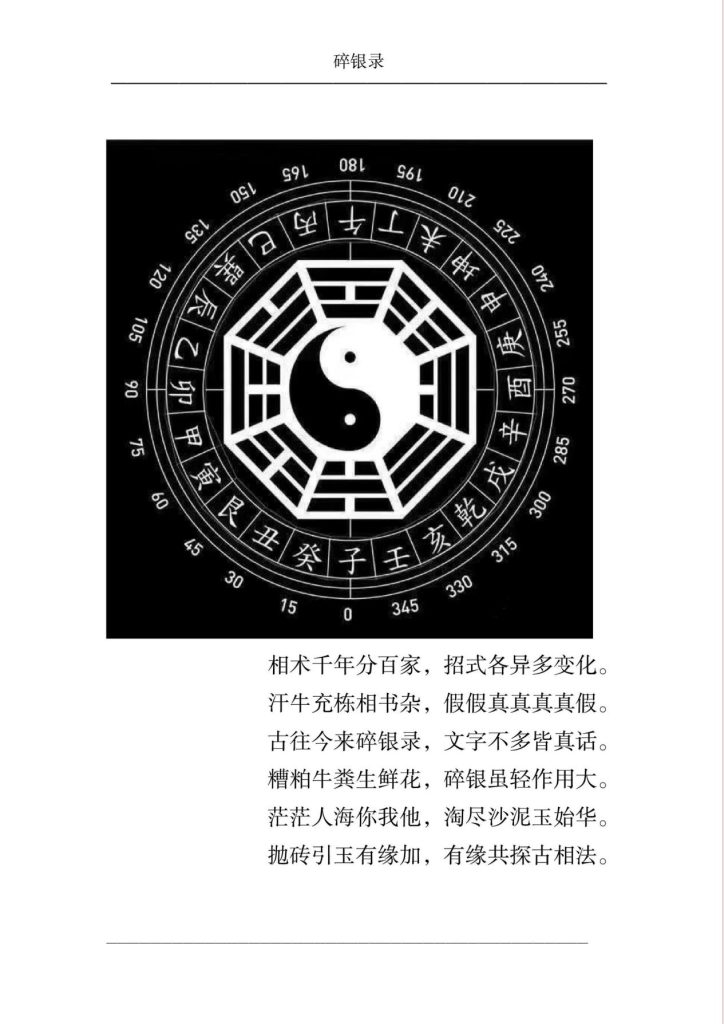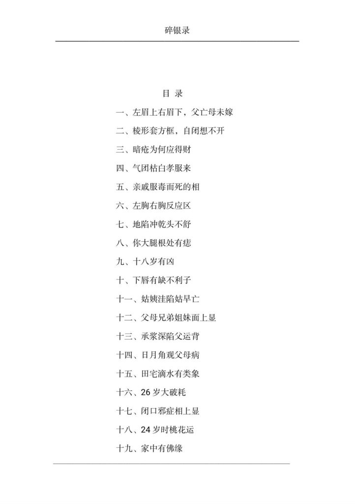 相人之法,由来久矣,历代高手辈出,相书著作汗牛充栋,但很 多相书都是泛泛而谈,你背书滚瓜烂熟给人看相时也不知去如何开 口。有些相书名字叫得响亮,如“xx绝招丶 xx秘诀丶 xx祖传丶百 试百验丶百发百中丶铁口直断、铁三关……”等等,多是标题党,实 际用它给人看相时一点也不准验。医者感叹“千方易得,一效难求。” 医书尚且如此,况相书乎? 余好数术,偶入相学之门,学海傲游数载,深感相道之奇妙,叹 相书晦奥而真诀稀少,学者登堂难如徒步登山。于是潜心钻研,四处 验证,得灵验之散招,汇集成册名为《碎银录》。文短字少如碎银, 抛砖引玉度妙法;下士闻道轻蔑笑,有心之人能悟道.