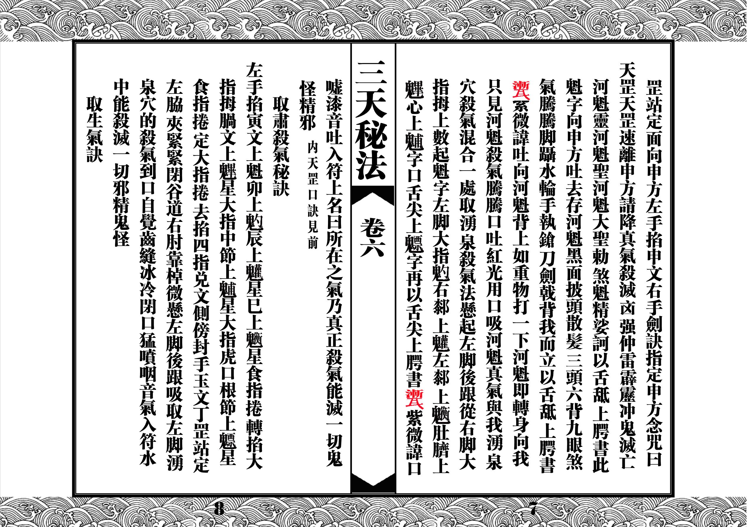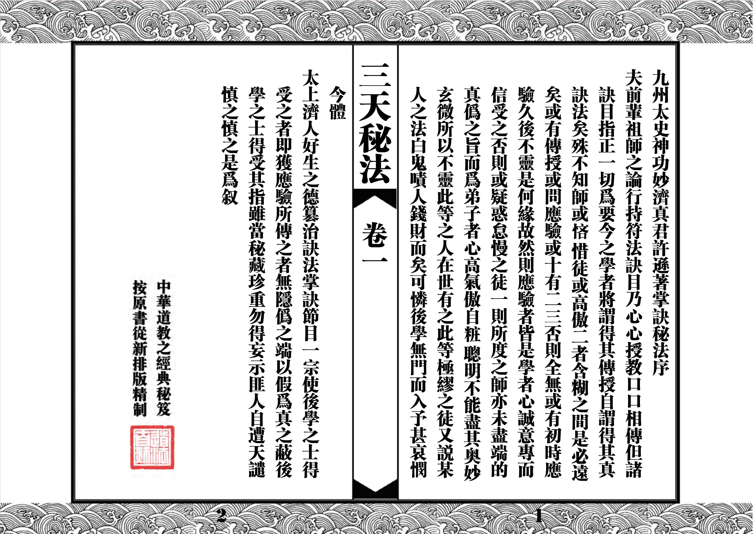 《三天秘法》乃道教净明派祖师九州太史神功妙济真君许逊著,全书合计七卷,分别为:掌决法旨卷之一,取气秘决卷二,天罡备要秘旨卷三,天罡备要卷四(画符),天罡备要卷之五(取三光气法),天罡备要卷之六(取诸气法),诸将召合卷七(雷帅招请)。