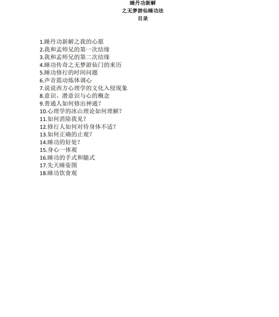 分为个三部分:先睡天姿图,心息相呼依吸法及以八部声息炼体术,以上是睡修功行的主内要容。
