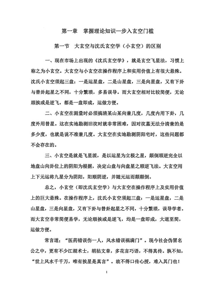 现在市场上出现的《沈氏玄空学》,就是玄空飞星法,习惯上称之为小玄空。大玄空与小玄空在操作程序上和实用价值上有很大悬殊。沈氏小玄空须起三盘:一是运星盘,二是山星盘,三是向星盘,又有下卦与替卦起星之不同,十分繁琐,多易误导。而大玄空相对比较简便,无论顺挨或是逆飞,都是一盘即成,运做方便。