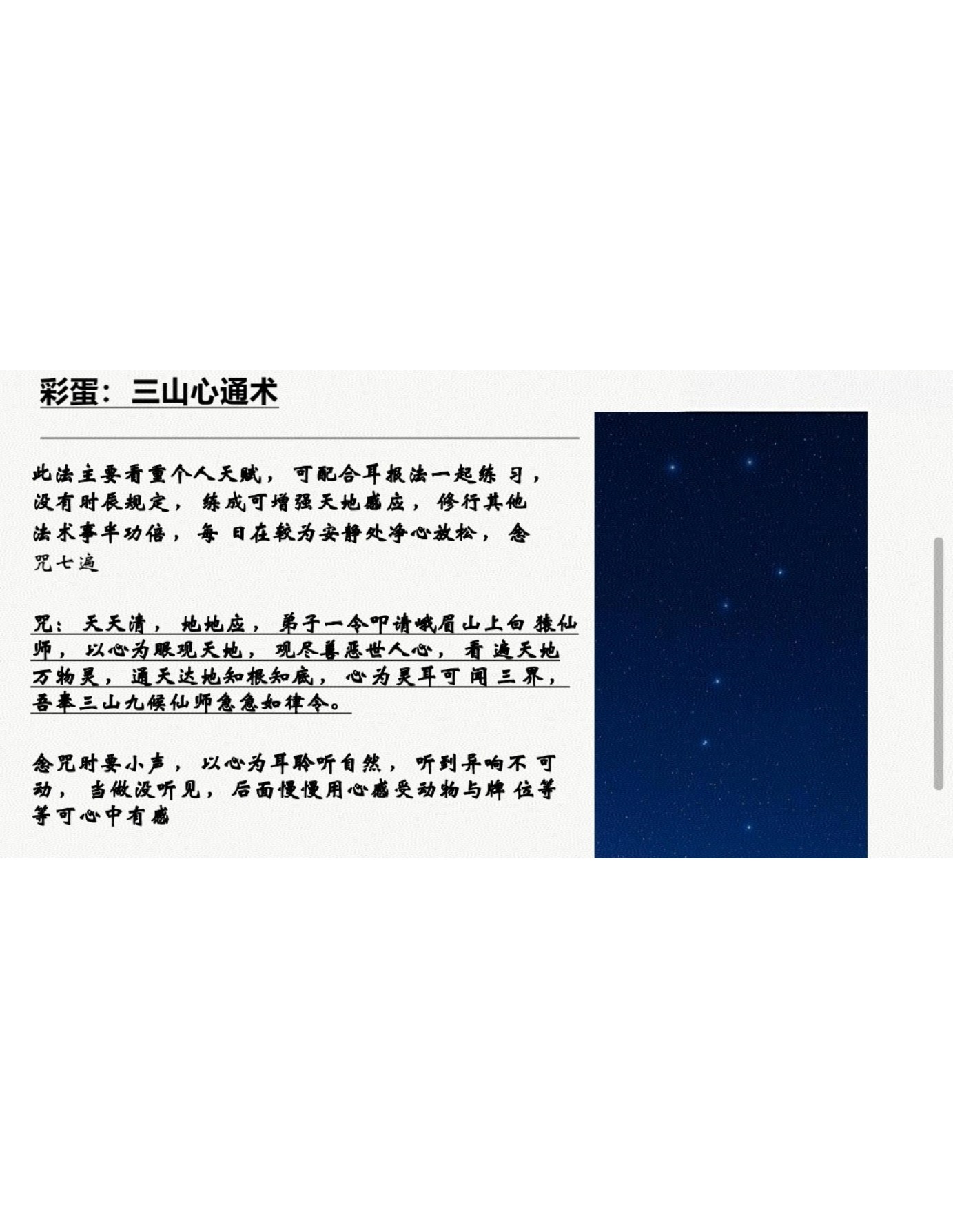 因过于强大只做家传,后面我师爷托于我让我去教出来!灵鹤阴阳诀中多为神仙之术,其中预测查邪还有显法都是绝技。有一个法叫灵鹤点观水,以水做总用,可惩恶可驱逐精怪,我师爷用过一次将此水倒入河中,河水一瞬间翻滚鱼虾皆蹦出水面