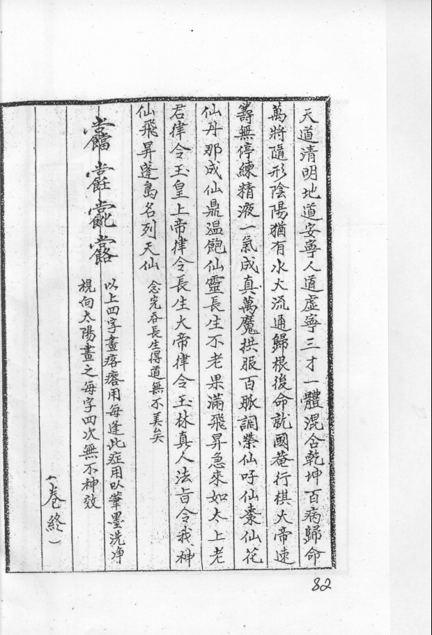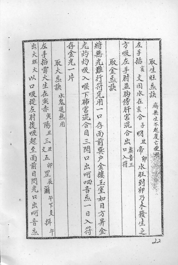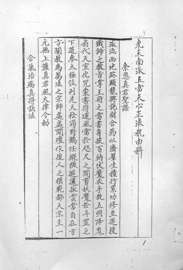 先天派秘传法本,内容有:崇恩真君圣诰、合气治病真符诀法、用法、诸字纲领、各种祝由秘字及其用法、太极左宫仙翁治万病符诀、敕笔书符敕笔纸咒、治上中下部病符及其咒语用法、天医神书序、取金气诀、取火气诀、取水气诀、信香符、召风科天医符、召大脉天医符、召眼科天医符、召小儿科天医符、召口齿科天医符、召外科天医符、召疮肿科天医符、召禁科天医符(各科总召符下配有诸症用符及咒语)、天皇神咒、秘符十五章(修道治病驱邪等内容)、咒枣秘诀、祝由科集方、治诸疮肿秘诀、九龙下海、治蝎子伤、治狗咬、辟蛊毒咒、葛仙翁宝诰、敕纸咒、治上中下部符等