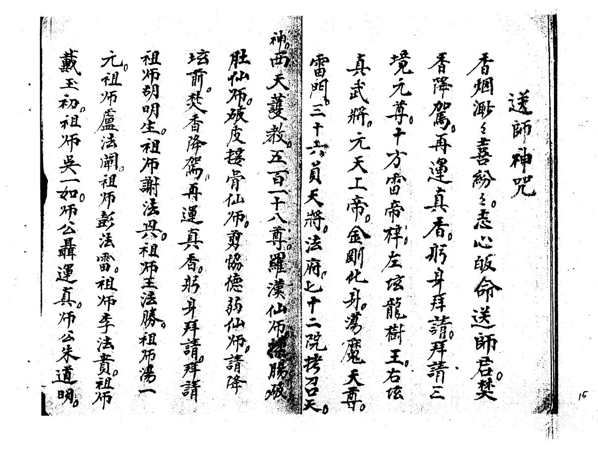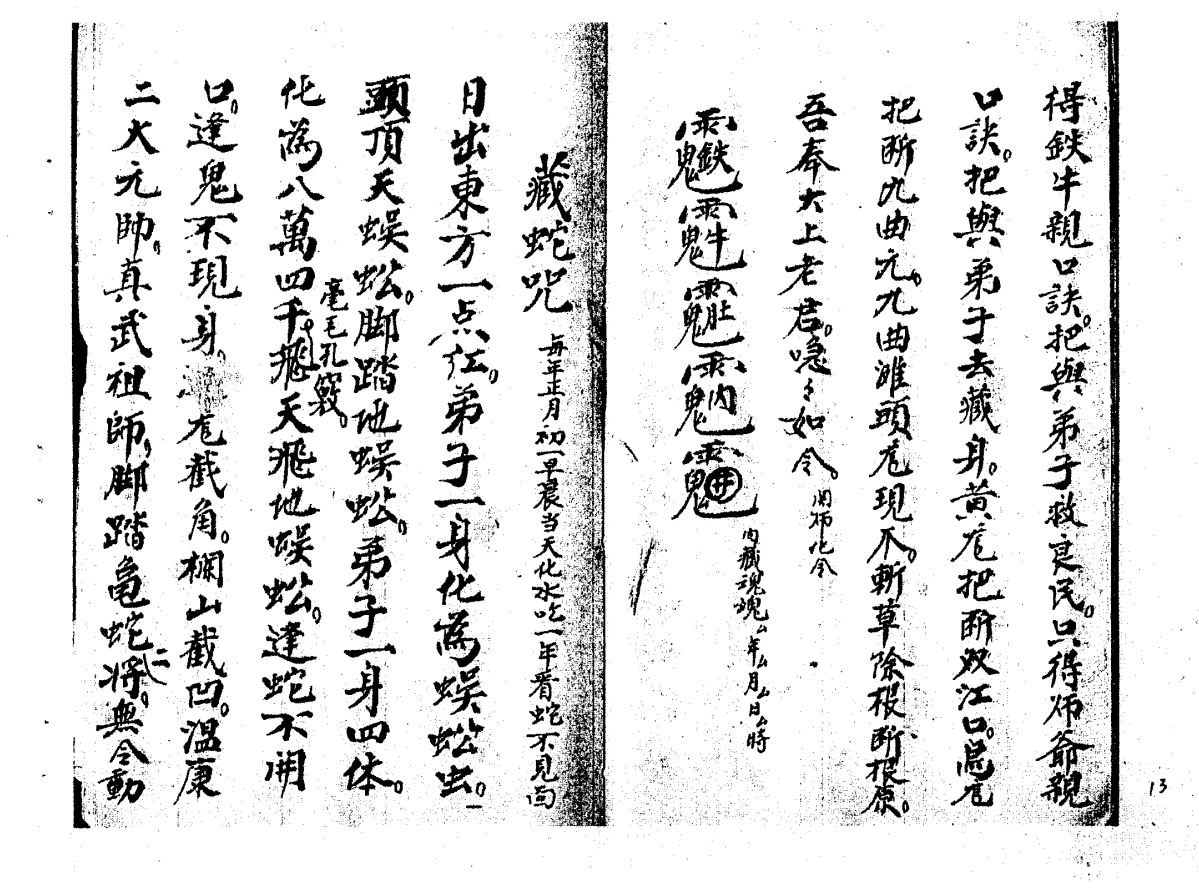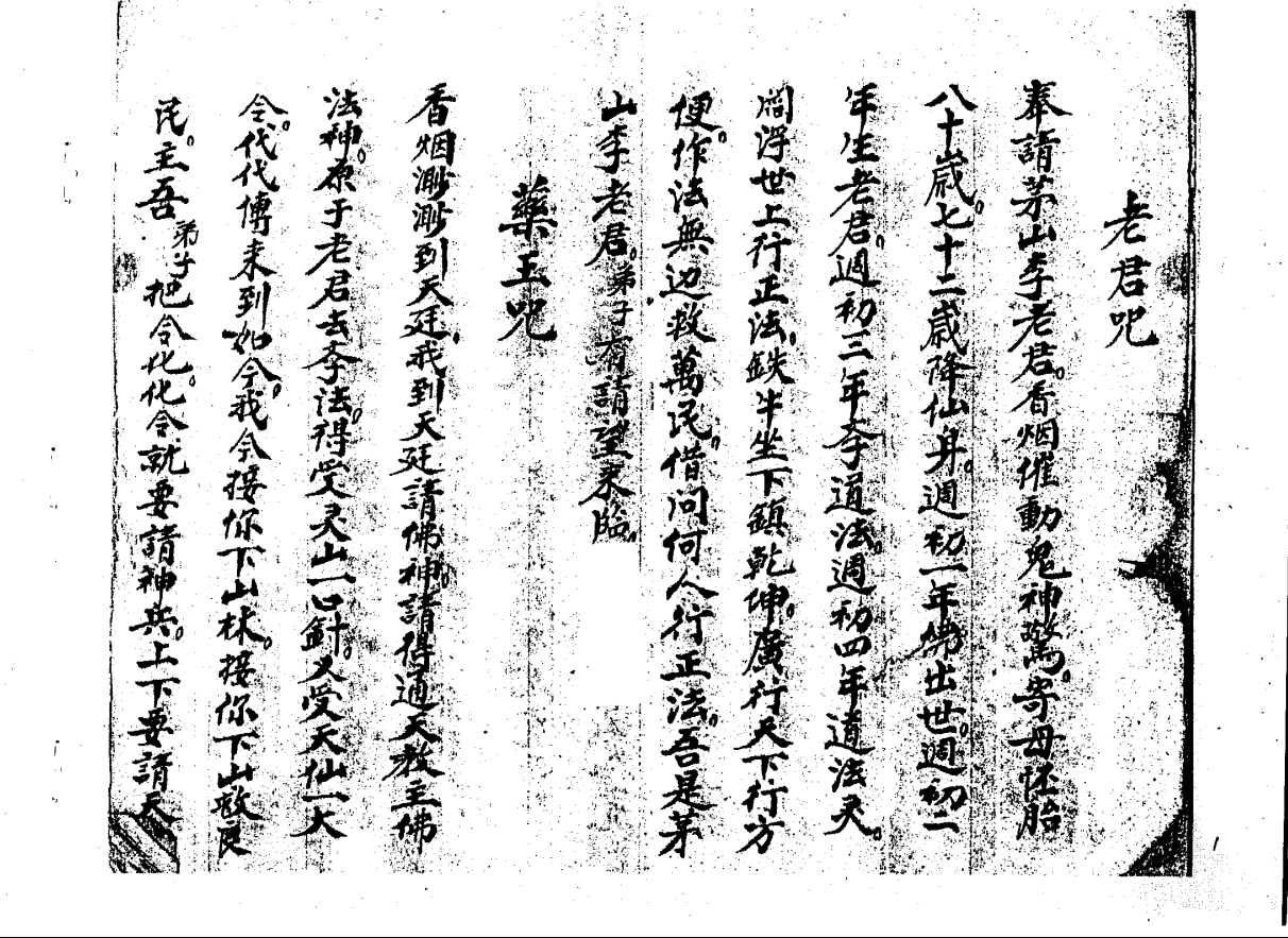 茅山李老君法脉秘传法本,书写工整,咒语后面都附有相应符令(如関师令)。有老君咒、药王咒、讃刀咒、讃鸡咒、隔山教住痛法、隔山教封血法、化扇扫邪退煞、喊犯煞、收惊法、化九龙水法、化眼睛法、起土法、捉化胁珠腿珠法、五雷咒、茅山咒、藏身咒、大藏身铁牛变化咒、藏蛇咒、送师神咒。