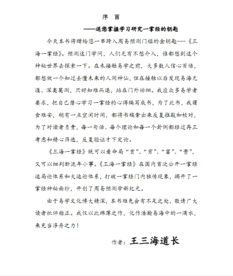 三海一掌经,顾前世、望今生、起卦快、看事精 好学也易懂,奥妙甚无穷 首次推出一掌经化解方法 赠送:小六壬马前课 辟谷 王三海老师,黑龙江道长。法号:云鹤子。在预测风水领域有很深的造诣。 一掌经又称《达摩一掌经》,也有人称《一掌金》。这是当时达摩在少林面壁的九年的时间里,所创的一部密法。以前在出家人之间秘密所传,但后来经过历届传人的沿袭和传播,现在也有极少数人在运用,但是都密不示人,别人也不知道是如何在瞬间得出结果的,所以一直充满着神秘的色彩。吾20年前有幸得其秘法,故今日愿传弟子,沿袭恩师所愿……